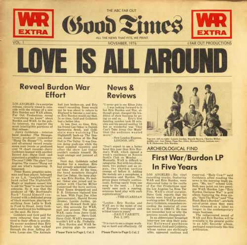 La storia del gruppo, però, partiva da molto lontano ed iniziò con l’incontro fra Howard Scott ed Harold Brown, ai quali si uniscono B.B. Dickerson, Charles Miller e Lonnie Jordan: siamo sul calare degli anni ’60 e, con il nome di Creators, i cinque musicisti cominciarono a girare per tutto il Sud della California a caccia di fortuna, esibendosi nelle situazioni più improbabili. Visti i modesti risultati, decisero di dedicarsi esclusivamente alla composizione e alla strutturazione di un proprio sound, cercando di ottenere uno stile ed un timbro che li potesse distinguere dalla moltitudine; soprattutto scelsero un altro nome: The Night Shift. Anche questa decisione non sembrò appagarli, né riuscì a produrre alcun interesse mediatico intorno alla band, fino a quando non decisero di chiamarsi War. Il nome War, venne dato per indicare, a detta di Lonnie Jordan, una battaglia «combattuta attraverso le note degli strumenti e non con i proiettili e le armi ». L’incontro con Eric Burdon, anima inquieta e vagante per le contrade d’America, ma già consegnata agli annali della storia della musica contemporanea, un bianco con una voce carica di balckness, amante del rock-blues, già leader degli Animals, segno per i War un nuovo inizio e soprattutto un viatico per la notorietà internazionale. «Eric Burdon Declaser War» e «Black Man’s Burdon» furono il frutto di un lavoro stimolante e prolifico, che fece conoscere il gruppo in tutti i circuiti del rock, specialmente in quegli ambienti bianchi ed europei, solitamente disinteressati alle vicende degli afro-americani, ma che, per contro, li allontanò dall’R&B e dai circuiti black almeno fino ad un certo momento della loro carriera. Per verità storica, va detto che i War, sin dal loro primo apparire, erano sempre stati un composita formazione musicalmente meticcia e multi-etnica nei proposti, soprattutto aperta ad ogni tipo di collaborazione ed infiltrazione creativa.