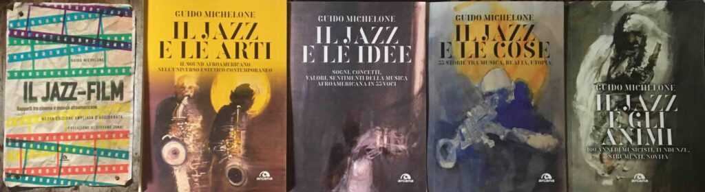 R. Alcuni dizionari di musica classica, di jazz, di rock, di cinema, di simboli. E anche molte storie del jazz, per lavoro. È una copia dei miei libri più recenti!