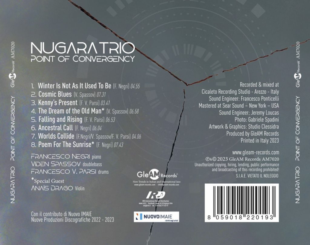 Il Nugara Trio con «Point Of Convergency» gioca essenzialmente sul concetto di circolarità che si chiude e si completa grazie alle affinità elettive fra i tre strumenti che sono di base ritmici e percussivi. Così Francesco Negri, Viden Spassov e Francesco Parsi riescono a dominare piano, contrabbasso e batteria, trovando quel punto nevralgico in cui essi si amalgamo e dove i demoni creativi sono contemporaneamente buio e luce, mentre la sensibilità musicale diventa estro gentile e forza esecutiva al contempo. Uno di punti di forza dell’album è proprio la mancanza di un pianismo dominante che metta all’angolo gli altri due strumenti; per contro il ribaltamento dei ruoli, nel rispetto degli equilibri compositivi, è ciò che rende vivo e brillante «Point Of Convergency». Il modulo pianistico di Francesco Negri è infatti caldo e avvolgente, ricco di pathos, poesia e fantasia, equilibrato nella sottolineatura dei silenzi e delle frasi improvvisative, con qualche linea di febbre di derivazione eurodotta che non cozza mai con gli accenti della tradizioni afro-americana e con le infiltrazioni folk, world music, pop o rock, abilmente centrifugate in un ingranaggio jazz scorrevole ed oleato. Il contrabbasso di Viden Spassov si staglia regolarmente con un suono corposo e vibrante sia sugli armonici che nel drive, cosi come le accentazioni e le figurazioni ritmiche del batterista, Francesco Parsi, garantiscono al trio un’eloquenza ed un vivacità di stampo contemporaneo.