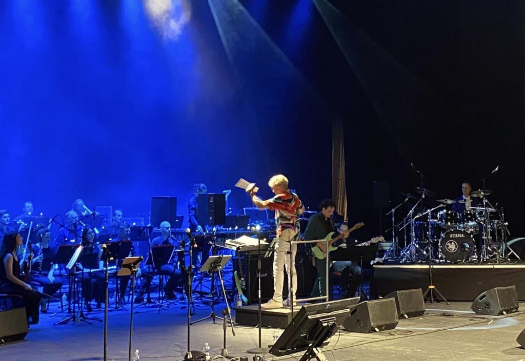 Come un highlander dalla fluente chioma canuta Stewart Copeland è giunto sullo stage dell’arena Santa Giuliana ricordando alla platea che il tempo è passato e che, a conti fatti, sono trascorsi quarant’anni da quando le canzoni dei Police furoreggiavano nelle charts internazionali e nell’airplay radiofonico di mezzo mondo. Ciononostante l’energia del signore dei tamburi è notevole, mentre il dato anagrafico è qualcosa che riguarda i comuni mortali presenti nel pubblico, magari vecchi fans dei Police, adesso sofferenti, con la PSA alta e la prostata ingrossata. Non a caso il batterista anglo-americano da subito l’idea di voler sterminare il mondo, iniziando il live-act con «Demolition Man». L’impeto è talmente tanto che, mentre dirige l’orchestra con le bacchette, ex-policeman urta violentemente il leggio scaraventandolo sulla sezione archi. Fortunatamente nessuno strumento o persona pare abbia subito danni. Soprattutto durante la performance Copeland dimostra al mondo di non essere un semplice battitore di pelli e di piatti, assurgendo al front-line con la chitarra, conscio di avere le spalle ben coperte da due corazzate: l’Orchestra da Camera di Perugia e l’Umbria Jazz Orchestra.