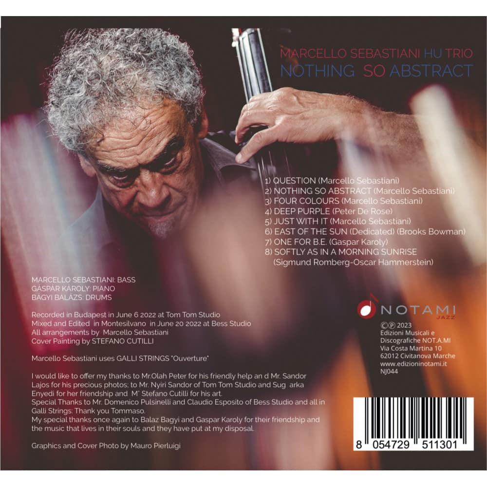 L’ascolto complessivo dell’album innesca stimoli molteplici. Traccia dopo traccia a cominciare dall’iniziale «Question» che conferma il gusto e la creatività di Marcello Sebastiani in veste di compositore, ma anche di ottimo tessitore di trame a maglie larghe, tanto da consentire il facile inserimento dei sodali, mentre la formula vincente si ripete soprattutto con la title-track, «Nothing So Abstract», in cui l’autore dimostra ampiamente di saper abbracciare tranquillamente passato e presente del jazz. «Four Colors» è la terza traccia in sequenza firmata da Sebastiani, ma costituisce anche il terzo esempio di modularità compositiva del contrabbassista, il quale consente al pianista di seguire una delle melodie più accattivanti dell’album, in un gioco di perfetto interscambio con la retroguardia ritmica. Con «Deep Purple», componimento di Peter De Rose, si cambia leggermente mood, ma si spalanca un’ottima vetrina espositiva in solitaria per il basso di Marcello Sebastiani, autore della successiva «Just With It», un up-tempo che esplora le radici del bop, ma senza guardare troppo nello specchietto retrovisore.