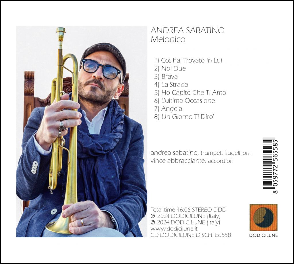 La melodia nella musica, a vari livelli, è il gancio che lega l’esecutore e il compositore al suo pubblico o ad ogni potenziale ascoltatore. La melodia è ciò che rende la musica «cantabile», essendo l’elemento distintivo di un brano o di un intero concept. La melodia è ciò generalmente determina non solo il piacere dell’ascolto nell’ambito di qualsiasi genere, ma il successo o meno di un disco. Nel jazz il contenuto melodico è ciò che, nel corso dei decenni, ha trasformato semplici componimenti in standard o in evergreen immortali. Quando la tradizione canora italiana, fucina di melodie a getto continuo, si travasa nel jazz, ne possono scaturire atmosfere fortemente evocative che ricontestualizzino il patrimonio melodico attraverso un differente metodo narrativo. Parlando dell’album del trombettista e flicornista Adrea Sabatino, edito dall’etichetta Dodicilune, possiamo dire senza tema di smentita: «Melodico, nomen omen!»