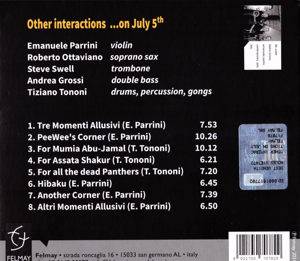 Tiziano Tononi ed Emanuele Parrini sono diventati negli ultimi anni una coppia artisticamente di fatto, specie negli album realizzati per la Felmey Records, i quali si muovono sul piano inclinato di una sintassi jazzistica e para-jazzistica multitematica e multilaterale, che tocca molti aspetti dello scibile sonoro, talvolta legati a profonde motivazioni di natura storico-sociale. Nelle produzioni di Tononi-Parrini, la prevedibilità e il dej-vu sono sistematicamente banditi: non si sa mai cosa aspettarsi, ma la sorpresa è pressoché appagante. «Other Interaction…On July 5th» è il sequel di un’avventura musicale partita nel 2022 con l’album «The Many Moods Of Interaction», in cui Parrini e Tononi si misuravano in duo, sul difficile terreno di interazione sine die e di un interplay suggestivo e ricco di spunti da poter ampliare e dilatare con un line-up più composito. Tutto ciò è accaduto con l’arrivo di Roberto Ottaviano sax soprano, Steve Swell trombone ed Andrea Grossi contrabbasso. Emanuele Parrini violino e Tiziano Tononi batteria, percussioni e gong hanno trovato tre sodali con i quali avevano interagito in altre occasioni, dunque capaci di dilatare e magnificare l’idea di un costrutto sonoro, complesso e vitale al contempo, proposto attraverso otto composizioni originali: tre farina del sacco del batterista e cinque del violinista.