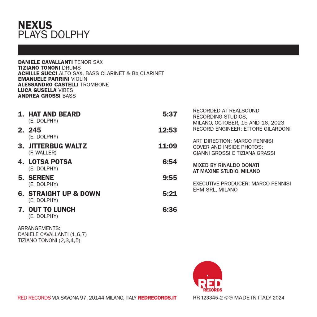 Il progetto dei Nexus, «Plays Dolphy» si dipana sulla scorta di sei composizioni dolphyane ed una lunga rilettura del «Jitterbug Waltz» di Fats Waller, secondo una modalità d’impiego che da sempre caratterizza la produzione del batterista Tiziano Tononi e del sassofonista Daniele Cavallanti, i quali in passato avevano già tributato altri eroi maudit del jazz moderno come Albert Ayler, John Coltrane, Ornette Coleman, Rahsaan Roland Kirk, Charles Mingus, John Carter e John Gilmore. La scelta di Dolphy diventa così per Tononi e Cavallanti un altro urlo di guerra ed una nuova sfida da consumare sul filo dell’alta tensione creativa ed emotiva, forti del sostegno di quattro sodali capaci di camminare sui carboni ardenti della trasversalità: Achille Succi alto sax, clarinetto basso & Bb Clarinet, Emanuele Parrini violino, Alessandro Castelli trombone, Luca Gusella vibrafono ed Andrea Grossi basso. Registrato al Real Sound Recording di Milano, il 15 e il 16 ottobre 2023, l’album mostra due anime inquiete sostanziandosi attraverso gli arrangiamenti di Tononi (tracce 1, 6 e 7) e Cavallanti (tracce 2, 3, 4 e 5), i quali trovano il giusto collettore nel violinista Emanuele Parrini.