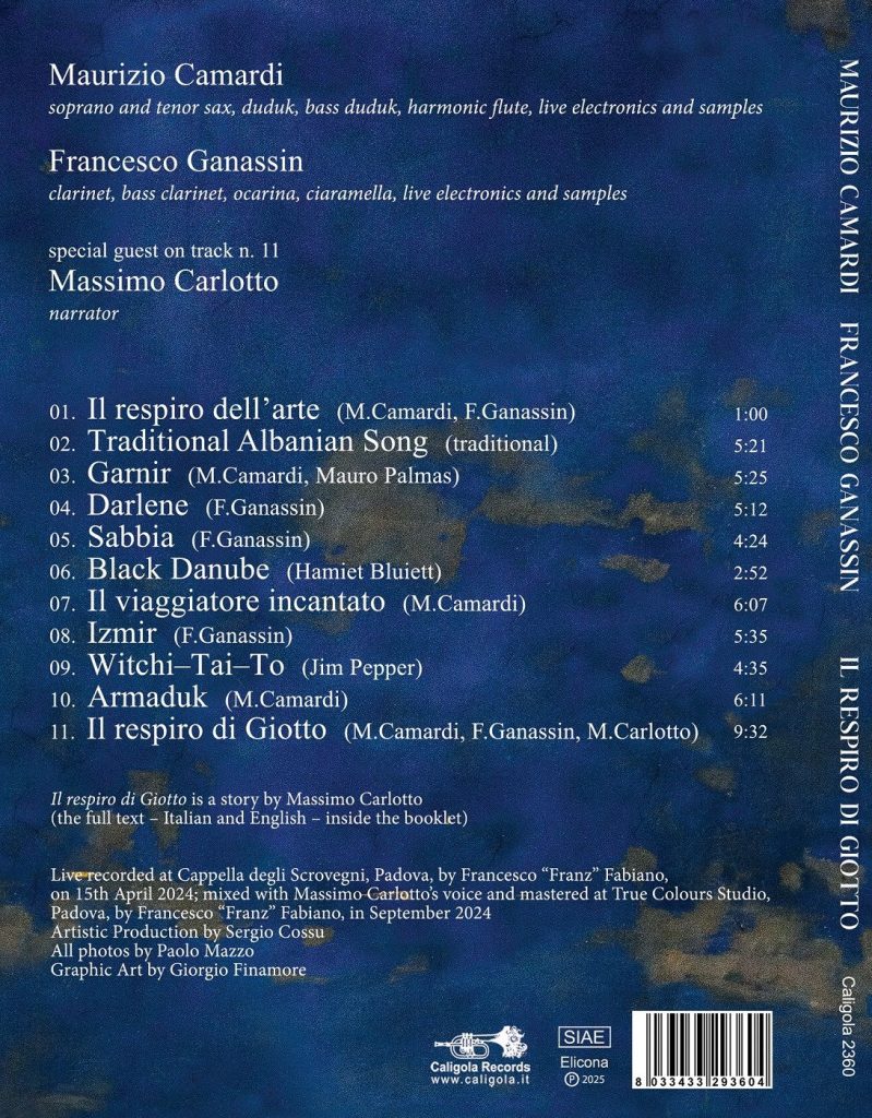 Il suono degli strumenti a fiato, le caratteristiche acustiche della sala e la risposta emotiva e sonora del pubblico si fondono in un’esperienza espressiva che si compie su più livelli, all’interno di un concept ripreso nell’aprile 2024 all’interno della Cappella di Scrovegni, ad eccezione del lungo brano finale, registrato in studio, che dà il titolo all’album, dove lo scrittore Massimo Carlotto dà voce a un breve racconto scritto per l’occasione, presente sia in italiano che in inglese nell’elegante booklet del CD pubblicato da Caligola Records, completato da splendide fotografie scattate nella cappella. Le arti figurative ritornano sia nel titolo che nell’oggetto di questo disco che ripercorre la magia del luogo dove la musica ha preso vita Nel 2024 il tandem ha prodotto un suggestivo spettacolo multimediale intitolato come il primo brano dell’album, «Il respiro dell’arte», in cui la musica intesse un dialogo con i colori di Kandinsky, Mondrian, Matisse e Frida Khalo. Le arti figurative tornano così al centro della loro attenzione, ma questa volta soltanto musicale, con «Il Respiro di Giotto», dove l’inimitabile blu del leggendario maestro fiorentino, fra i massimi esponenti dell’arte pre–rinascimentale italiana, diventa ispirazione e filo conduttore di un immaginifico viaggio sonoro che, pur non trascurando i riferimenti jazzistici – Black Danube, Witchi–Tai–To e Darlene ne sono la più significativa testimonianza – fa di tutto per superarli. Si passa così dall’ipnotico incedere di un brano tradizionale albanese all’affascinante Armaduk, la composizione originale che Camardi ha riproposto più frequentemente nelle sue incisioni, ma anche dalle cadenze arabe di Izmir alle dolci e accattivanti melodie di Garnir, Il viaggiatore incantato o Sabbia.