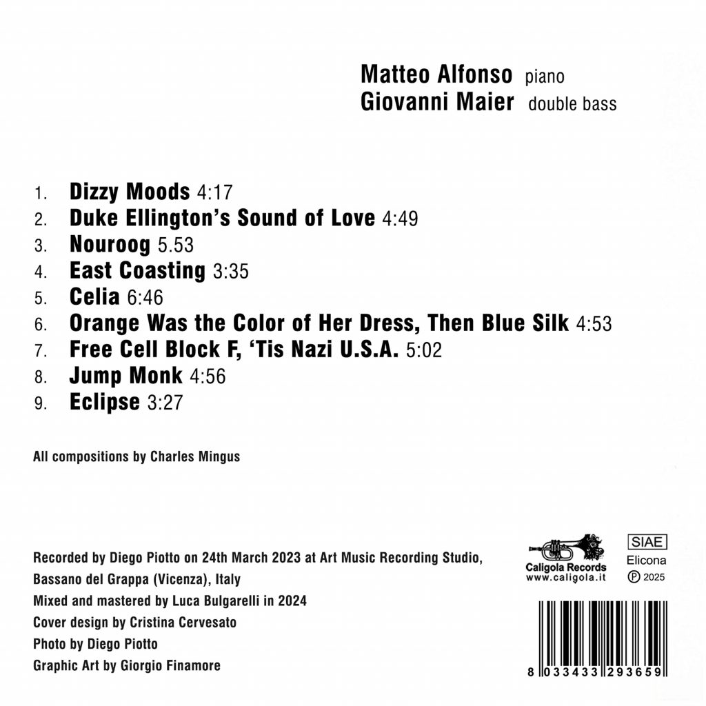 La scelta repertoriale dei brani riflette un’attenta cura nella rivisitazione del catalogo mingusiano. Oltre ad alcuni gioielli di casa Mingus, i due musicisti affrontano anche composizioni meno frequentate. Tale opzione sancisce la volontà di indagare territori di caccia meno battuti, conferendo all’album un carattere distintivo. Il lavoro di registrazione presso l’Art Music Recording Studio di Bassano del Grappa e la successiva post-produzione a Roma garantiscono una qualità audiofila, grazie alle geometrie bilaterali in cui il suoni si coagulano e si sciolgono, valorizzando la profondità timbrica del contrabbasso e l’eleganza melodica del pianoforte. «Mingus Revisited» si sostanzia come un’incursione affascinante e coraggiosa nel parenchima armonico del contrabbassista di Nogales, condotta con discernimento e rispetto da due jazzisti di lungo corso. «Dizzy Moods» si distingue per la struttura sincopata e l’energia pulsante. Alfonso e Maier ne scodellano una versione asciutta, lasciando spazio al dialogo serrato tra pianoforte e contrabbasso, dove l’improvvisazione si srotola senza particolari ganasce. «Duke Ellington’s Sound Of Love» è una delle composizioni più liriche di Mingus interpretata con estrema delicatezza. Il pianoforte di Alfonso enfatizza la melodia con un tocco morbido e contemplativo, mentre il contrabbasso di Maier aggiunge assertività , mantenendone intatta la natura evocativa. «Nouroog», uno dei territori meno battuti del catalogo mingusiano, si qualifica per le atmosfere sospese e il fraseggio enigmatico. La versione proposta nel disco ne accentua la natura introspettiva, con un’interazione strumentale, armonicamente sorretta da un duello basato su reiterate tensioni e rilassamenti.