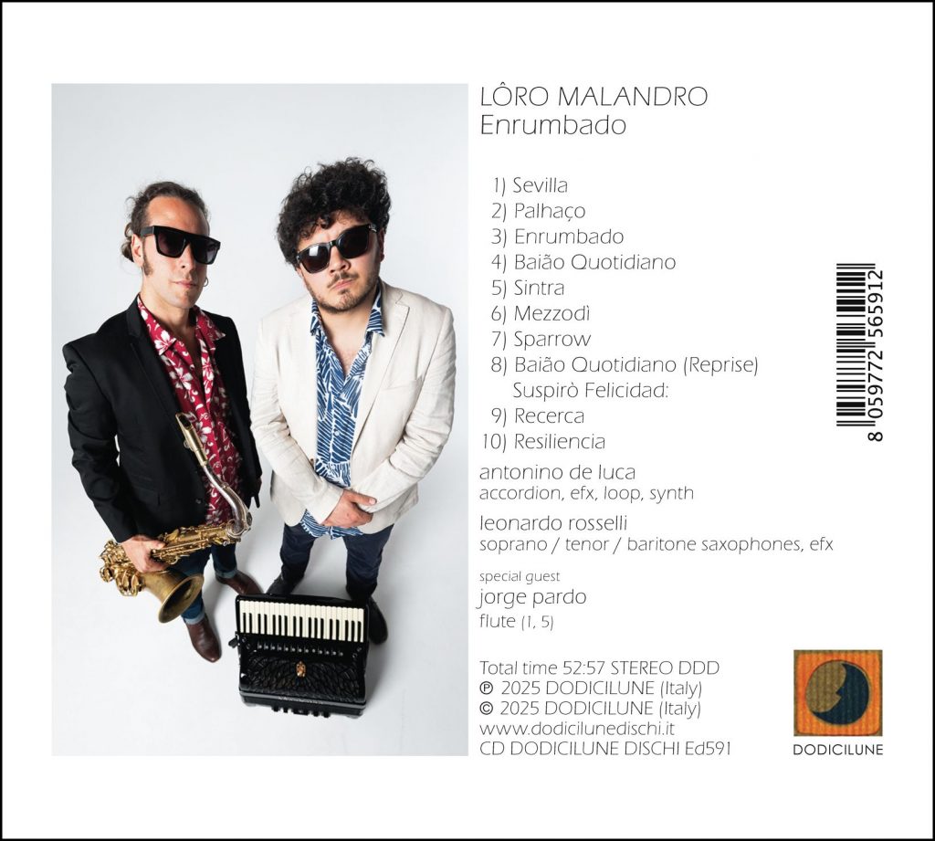 «Enrumbado» non è un semplice disco: è un animale strano ed affascinante che parla più lingue, vive in più mondi e non chiede il permesso per entrare in scena. Antonino De Luca e Leonardo Rosselli non si limitano a suonare, ma costruiscono un organismo vivente fatto di fisarmonica, fiati, elettronica ed intuizioni che scorrono come un torrente. L’incontro con Jorge Pardo non è ospitale, ma necessario: il suo flauto non impreziosisce, ma stravolge in profondità, è un atto rituale che evoca il flamenco, ma lo attraversa senza folklore, di cui rimane un battito irregolare e febbrile. Il disco apre con «Sevilla», dove Jorge Pardo, ospite d’eccezione, soffiando nel suo flauto, dà il via a una geografia sonora senza confini. La fisarmonica di De Luca ed il sax di Rosselli non accompagnano, ma rispondono, suggeriscono ed insinuano come voci che si conoscono da tempo ma si ascoltano ancora con curiosità. Da subito si capisce che il linguaggio sarà fatto di incontro, non di incastro. Poi arriva «Palhaço», la carezza di Gismonti: non riprodotta, ma ricreata. Il duo sembra raccontare il brano come se fosse una fiaba da tramandare, con Rosselli che tesse il filo narrativo e De Luca che ne colora gli angoli. Non è una cover, ma un dialogo rispettoso ed inquieto con una figura mitica; i musicisti non si inginocchiano, ma si avvicinano con mani aperte. Quando si arriva a «Enrumbado», il disco prende coscienza di sé, mentre il titolo diventa stile, quasi il gesto libero ed un po’ ladro del bambino birichino (lôro melandro in portoghese) che vola tra i generi senza fare il nido. È qui che l’anima vagabonda del progetto esplode, tra loop, synth e fraseggi che sembrano rubati ad una festa segreta.