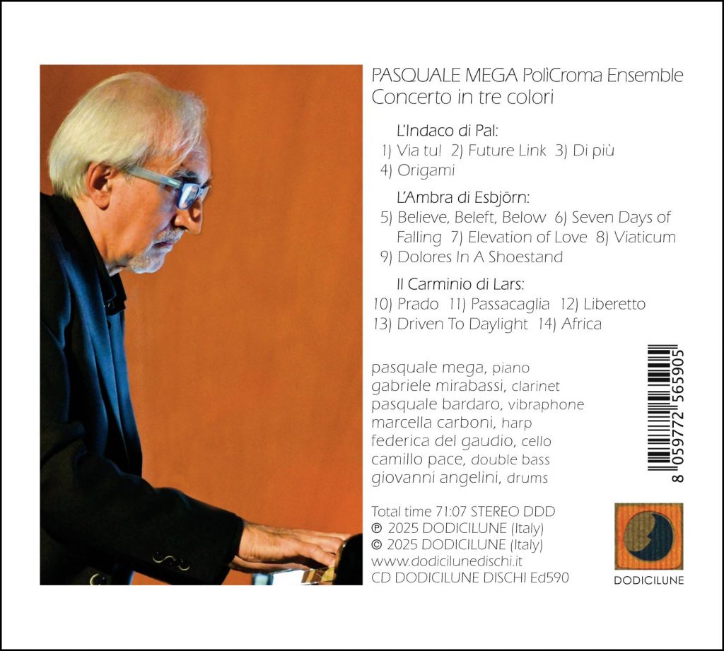 «Concerto in tre colori», esito da Dodicilune, non trasporta un semplice carico di episodi sonori, ma si caratterizza sulla scorta di un impianto compositivo che riflette una visione stratificata e consapevole del fare musica, tenendo bene a mente la contemporaneità e l’hic et nunc. Pasquale Mega, nella duplice veste di pianista e ideatore, dirige il PolìCroma Ensemble, ne fila la genetica interiore, ne scolpisce la fisionomia acustica e ne orienta la logica estetica secondo una prospettiva che rifiuta ogni dicotomia tra jazz e scrittura colta. La scelta strumentale, che affianca al quintetto jazzistico risponde ad una precisa volontà di ampliare il ventaglio timbrico e d’imbastire una tessitura armonica che sappia accogliere tensioni e rilievi, sfumature e contrasti, al netto di ogni tentazione ornamentale.