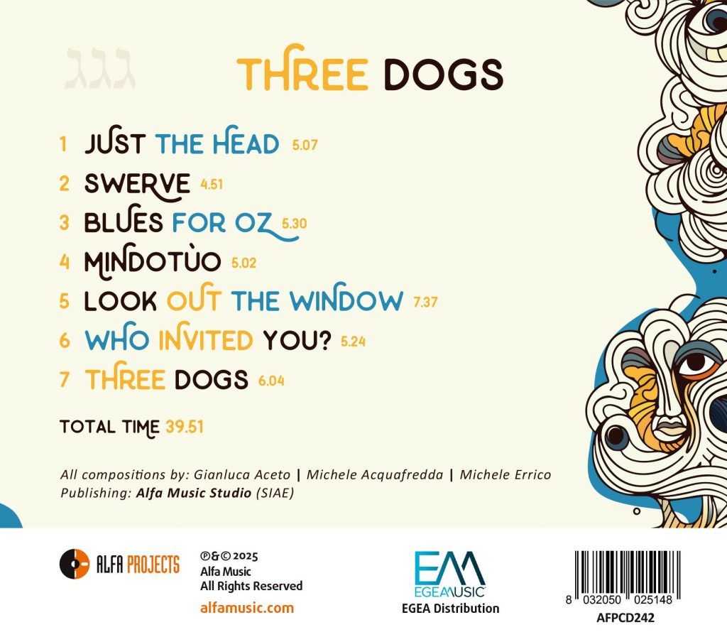 «Just The Head» apre le danze con un’iperbole sonora che, sin dalle prime note, rivela una decisa impronta acida. La composizione, caratterizzata da un riff di chitarra tagliente e da un ritmo incalzante, si dipana come un’esplorazione sonora volta a destabilizzare l’ascoltatore, preparandolo ad un viaggio musicale ricco di sorprese. L’uso sapiente degli effetti, creando un’atmosfera densa di tensione, contribuisce a generare un’esperienza d’ascolto coinvolgente e intensa. In «Swerve», il trio evidenzia la propria capacità di variare il registro espressivo. L’ordito sonoro, pur mantenendo una certa energia, si concentra su un’ambientazione più melodica e funkfieed, con un’attenzione particolare alla costruzione armonica. L’interplay tra gli strumenti, in questo caso, raggiungendo livelli di eccellenza, crea un dialogo musicale ricco di sfumature e di contrasti. «Blues For Oz» rappresenta un omaggio sentito a Oz Noy. Il componimento si srotola come una dichiarazione d’amore al rock-blues, filtrata attraverso la sensibilità del trio. L’intreccio accordale, pur mantenendo la struttura tipicamente bluesy, si arricchisce di elementi jazz ed accenti psichedelici, sviluppando un ibrido stilistico di eccellente risonanza. L’assolo di chitarra, in particolare, si distingue per l’assertività e per la capacità di riportare in auge atmosfere urbane, malinconiche ed intense al contempo. L’atmosfera in «Mindotùo» diviene esotica, sulla scorta di sonorità orientali. La presenza di Maurizio Lampugnani alle percussioni, conferendo alla composizione un tocco di terzomondismo, arricchisce la trama sonora di colori, essenze e ritmi inattesi, in cui l’interazione tra gli strumenti raggiunge un livello di complessità e di pregevole raffinatezza. L’atto compositivo raggiunge il suo apice in «Look Out The Window», un episodio che scivola sul piano inclinato dell’eleganza, per la sua versatilità di pennellare atmosfere quasi cinematiche. La melodia, delicata e intensa, legandosi ad un’armonia bene articolata, dà vita a un’esperienza d’ascolto totalizzante, quasi seduttiva. Il triunvirato dimostra la versatilità nel tastare e testare differenti generi e moduli espressivi in «Who Invited You?» che si solidifica come una perlustrazione territoriale che spazia dal jazz al rock, con incursioni nel funk e nel progressive. L’energia affiora in maniera palpabile, così come la voglia di mettersi in gioco e di superare i confini stilistici e le barriere armoniche. L’album si chiude con la title-track, un componimento che sembra sintetizzare l’essenza stessa del progetto. L’impianto, elaborato e modulare, racchiude in sé tutte le caratteristiche che rendono «Three Dogs» un album di facile fruizione, dove la passione per il loisir, la ricerca timbrica, l’attitudine a far emergere situazioni evocative ed il desiderio di sperimentare, agevolano un percorso fortemente stimolante, finalizzato ad approfondire l’operato complessivo del trio.