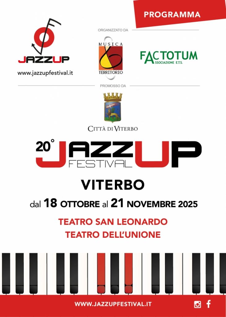JazzUp Festival Viterbo ha organizzato una ventesima edizione di grande livello, con grandissimi artisti. Un programma molto eterogeneo, con un‘offerta di ben 10 concerti, in modo da riempire tante serate dell’autunno viterbese. Il Festival si svolgerà sia presso il Teatro San Leonardo (Via Cavour, 9), sia presso il Teatro dell’’Unione (Piazza Verdi, 10). Gli organizzatori ringraziano tutte le Istituzioni, gli Sponsor ed i Partner, che non smettono di credere in questo evento, cosi come la Sindaca di Viterbo Chiara Frontini, l’Amministrazione Comunale e l’Assessore alla Cultura Alfonso Antoniozzi.