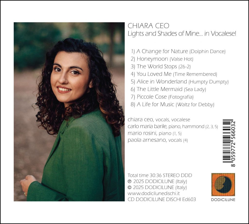 Prodotto dall’etichetta Dodicilune, «Lights and Shades of Mine… in Vocalese!» di Chiara Ceo si caratterizza come pagina musicale di notevole rilievo, non soltanto per la qualità interpretativa della vocalist pugliese, ma per la consapevolezza con cui viene affrontato il terreno del Vocalese. La presenza di Carlo Maria Barile all’Hammond ed al pianoforte, insieme agli interventi di Mario Rosini e Paola Arnesano, arricchisce la tessitura sonora con un dialogo continuo tra voce e tastiere, tra parola e armonia, tra colore fonico ed invenzione melodica.