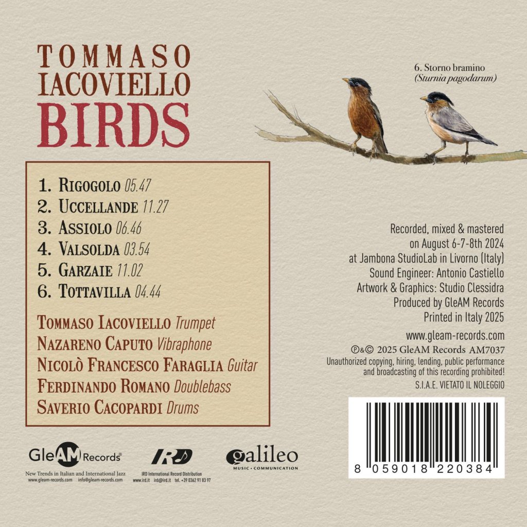 «Garzaie» s’ispira alle colonie di aironi, trasfigurando il loro habitat in un tessuto sonoro complesso. La tromba articola frasi ampie, mentre la chitarra e il vibrafono creano un intreccio di armonie delicate. La batteria di Saverio Cacopardi, con tocchi inventivi, suggerisce il movimento collettivo degli uccelli. L’insieme si presenta come un episodio sonoro stratificato, dove la coralità naturale diventa materia musicale. La chiusura dell’album si concentra sul canto della «Tottavilla», traslato in un linguaggio jazzistico che alterna momenti lirici e sezioni improvvisative. La tromba si muove con sensibilità immaginativa, mentre il quartetto accompagna con un groove organico. La composizione si distingue per la capacità di trasformare un canto naturale in pagina musicale eloquente, con un equilibrio tra rigore e libertà. «Birds» si colloca nell’alveo di una ricerca che unisce ecologia e musica, delineando un percorso originale nel panorama jazz contemporaneo. Ogni traccia diventa una mappa sonora ed un omaggio a taluni ecosistemi fragili che rischiano di essere sommersi dal rumore artificiale. L’ensemble guidato da Iacoviello riesce a sagomare un repertorio che non si limita a evocare la natura, bensì la reinventa, elaborando il canto degli uccelli, il fruscio delle foglie e il fluire dell’acqua in linguaggio musicale.