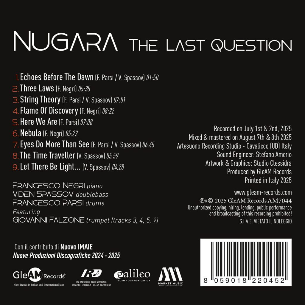 «The Last Question» dei Nugara, edito dalla GleAM Records, si dipana su un itinerario sonoro concepito con rigore formale e slancio immaginativo, in cui il trio guidato da Francesco Negri al pianoforte, con Viden Spassov al contrabbasso e Francesco Parsi alla batteria, s’affida ad una logica compositiva che alterna chiarezza architettonica e libertà controllata. La presenza di Giovanni Falzone alla tromba, in «String Theory», «Flame Of Discovery», «Here We Are» e «Let There Be Light…», introduce un profilo acustico che agisce come un dispositivo di luce, un segnale direzionale che ridisegna la prospettiva dell’ensemble senza infrangerne l’ordine interno. L’immaginario fantascientifico evocato dalla copertina non resta un semplice apparato iconografico, si traduce in un codice espressivo che orienta la scrittura, l’articolazione delle sezioni, la gestione del respiro e l’interazione tra i sodali.