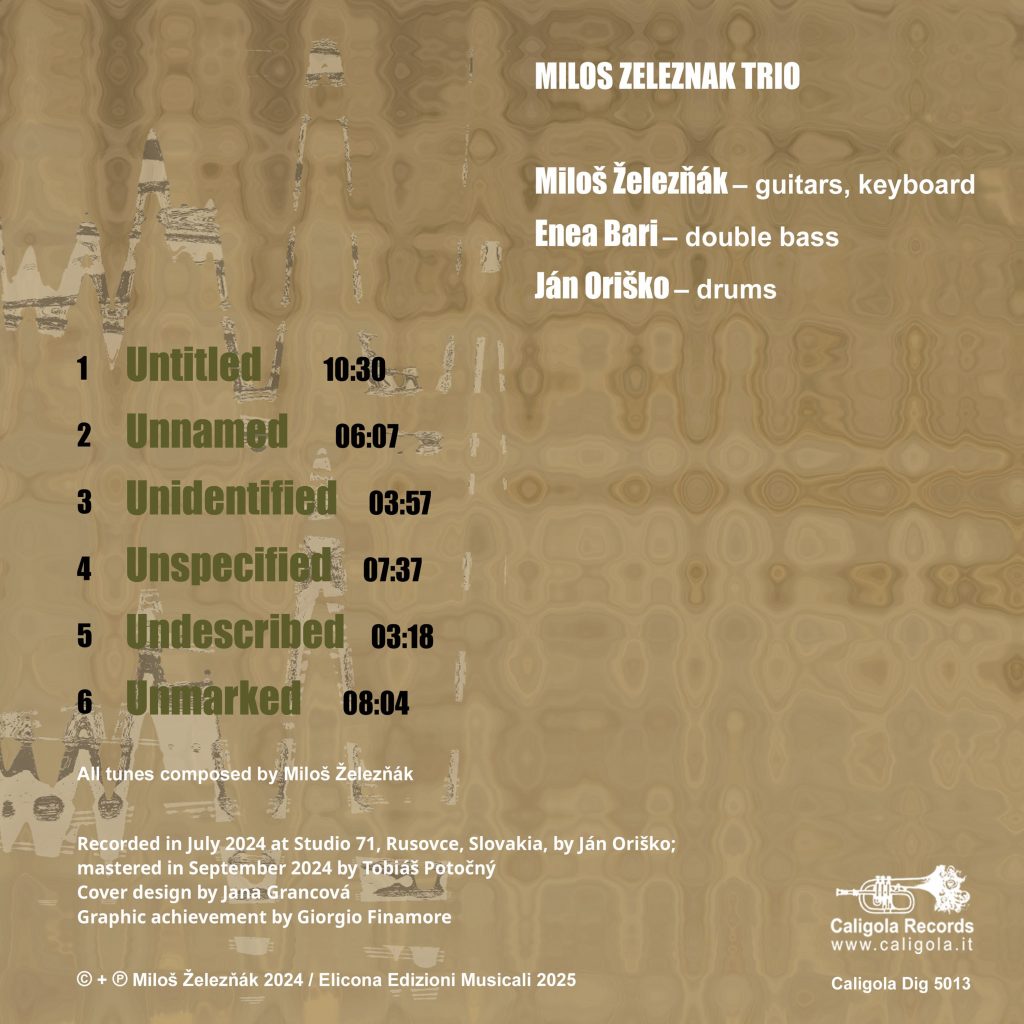 Železňák, musicista di solida formazione e dotato di una sensibilità armonica nutrita tanto dalla tradizione centro-europea quanto dalle derive più radicali dell’improvvisazione contemporanea, implementa pagine musicali che alternano cellule tematiche essenziali e zone di libertà controllata. Le sue chitarre delineano profili acustici che oscillano tra rarefazione e incisività, mentre il ricorso episodico alle tastiere introduce velature foniche che ampliano la prospettiva del trio senza snaturarne la fisionomia. Enea Bari interviene con un contrabbasso dalla cavata ampia e risonante, abile nel scolpire linee che fungono da perno armonico e da impulso narrativo, mentre Ján Oriško, forte di un ascolto reattivo e immaginativo, modella un ambiente percussivo che non si limita a sostenere, ma stabilisce le coordinate del flusso tematico, suggerendo deviazioni, rallentamenti ed aperture inattese. La sequenza dei titoli – «Untitled», «Unnamed», «Unidentified», «Unspecified», «Undescribed», «Unmarked» – non allude a un vuoto semantico, ma attiene piuttosto a un rifiuto deliberato di incasellare l’esperienza sonora entro categorie predefinite. Ogni composizione si presenta come un campo di possibilità, un territorio in cui la struttura emerge per accumulo di micro-eventi, per sovrapposizione di gesti minimi, per risonanze che si propagano nel tempo. La scrittura di Železňák procede secondo una logica di sottrazione, lasciando che il silenzio diventi materiale strutturale e che gli spazi tra le note assumano un ruolo pari a quello delle linee melodiche. Ne deriva un clima che oscilla tra contemplazione e inquietudine, sempre in equilibrio instabile, sempre pronto a mutare direzione.