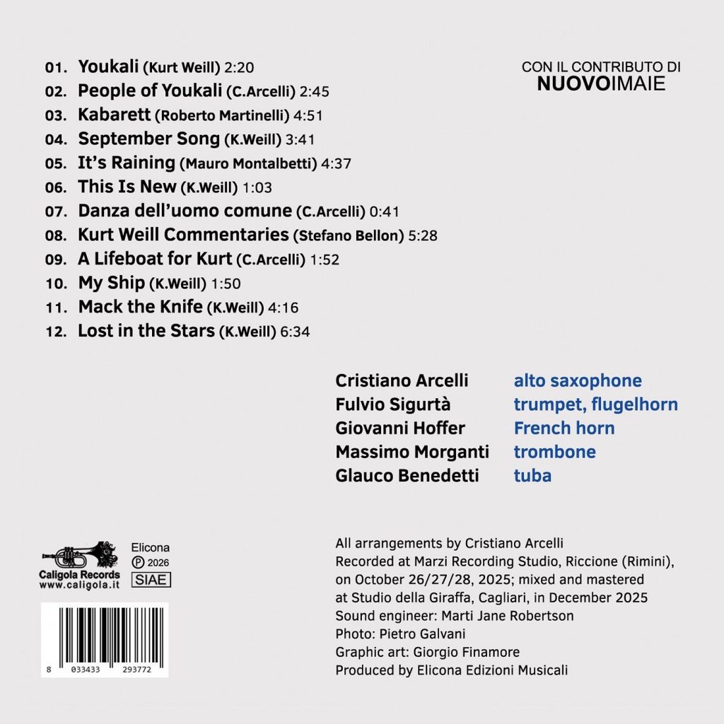 Accanto alle rielaborazioni, Arcelli firma tre composizioni originali che non cercano di imitare Weill, bensì ne assorbono la logica interna: progressioni che si muovono per semitoni, melodie costruite su intervalli spigolosi, e un senso del ritmo che alterna pulsazione regolare e micro-scarti quasi coreografici. «People Of Youkali», «Danza dell’uomo comune» e «A Lifeboat For Kurt» rivelano un autore di solida formazione, abile nel far dialogare ironia, malinconia e rigore strutturale senza scadere nella caricatura. Il progetto si amplia ulteriormente grazie ai contributi di Stefano Bellon, Roberto Martinelli e Mauro Montalbetti, tre compositori provenienti da ambiti differenti, chiamati a misurarsi con l’eredità weilliana secondo una prassi mutuata dal mondo classico. Le loro pagine estendono il raggio estetico dell’album: Bellon lavora su strutture frammentate e su un uso quasi percussivo degli ottoni; Martinelli introduce una teatralità più marcata, con sezioni che evocano scenografie sonore; Montalbetti predilige un andamento in equilibrio instabile, dove la melodia affiora e si ritrae come un gesto trattenuto. Il contributo dei solisti risulta determinante. Fulvio Sigurtà alterna un colore sonoro nitido e un fraseggio più rarefatto, sempre controllato; Massimo Morganti offre un trombone dalla trama espressiva mobile, capace di passare da un registro lirico a uno più incisivo; Arcelli modella il sax contralto con una voce musicale immaginativa, mai esibita, sempre funzionale alla struttura.