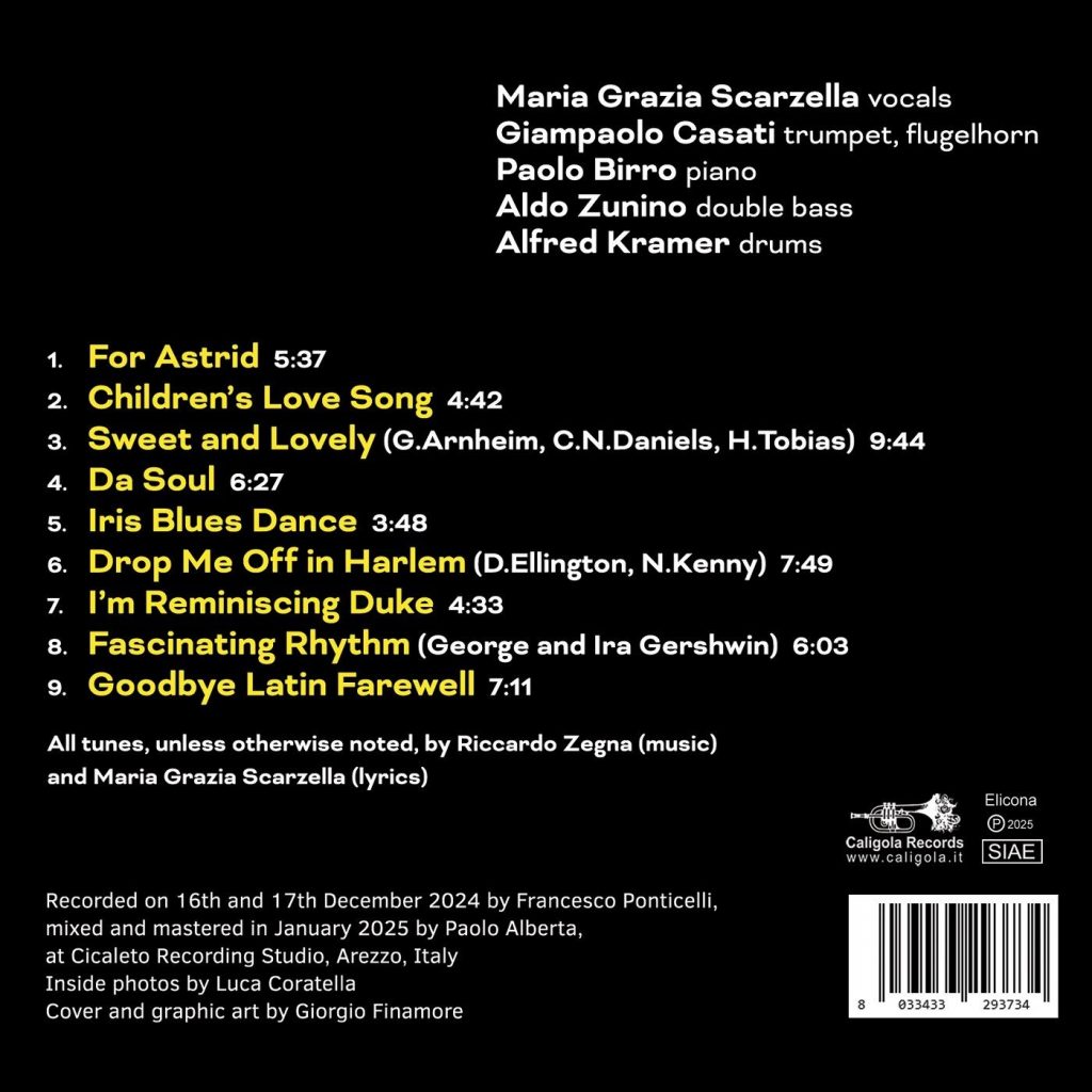 La sezione ritmica, formata da Zunino e Kramer, costruisce un terreno elastico e mai prevedibile. Il contrabbasso del primo, sempre accurato nella definizione delle fondamentali e delle sostituzioni, sostiene l’armonia con una chiarezza che permette alla voce di espandersi senza forzature. Kramer, dal canto suo, lavora su una gamma di colori percussivi che non cercano l’effetto, ma una sorta di respiro interno, un andamento che ricorda certe soluzioni della scuola europea degli anni Ottanta, dove la batteria assumeva un ruolo di mediazione timbrica più che di propulsione. Casati interviene con interventi misurati, spesso costruiti su linee che sfruttano intervalli ampi e una sonorità levigata, quasi a evocare un’idea di lirismo trattenuto, lontano da ogni enfasi. Le tre riletture di standard, tra cui una pagina ellingtoniana raramente affrontata, rivelano un’attenzione particolare al rapporto tra tradizione e reinvenzione. Scarzella non cerca un’adesione filologica, ma una ricollocazione delle strutture originarie all’interno di un ordine interno più vicino alla poetica di Zegna. «Sweet And Lovely» e «Fascinating Rhythm» vengono così ripensate secondo un disegno armonico che predilige modulazioni morbide, sostituzioni cromatiche e un uso calibrato delle tensioni superiori, mentre «Drop Me Off in Harlem» trova una nuova vitalità grazie a un lavoro di sottrazione che mette in primo piano la qualità narrativa della voce.