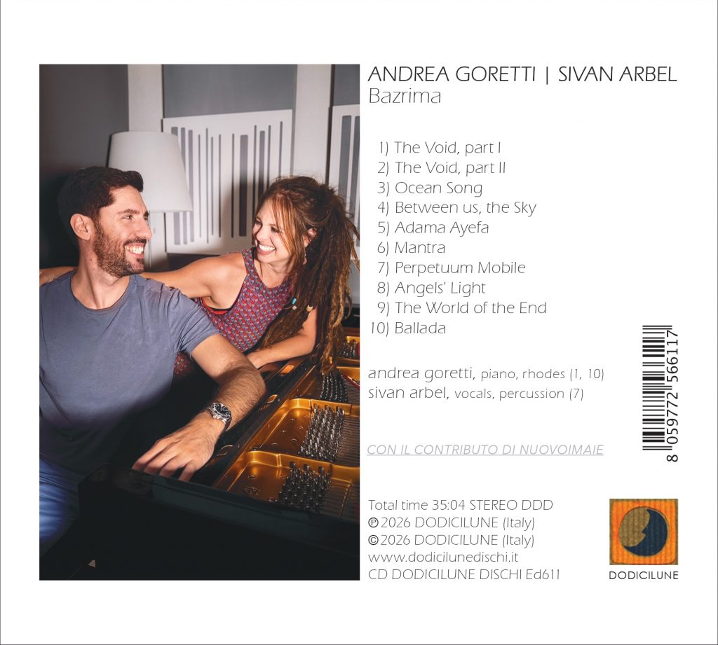 La collaborazione tra Andrea Goretti e Sivan Arbel si sostanzia in «Bazrima», quale esito di una convergenza lenta e consapevole, maturata nel tempo e sedimentata in una pratica condivisa dell’ascolto reciproco. Il pianoforte e la voce non assumono mai ruoli gerarchici, ma si spostano all’interno di una relazione paritaria, in cui ogni azione sonora risponde a una necessità implicita, più che a un’esigenza espressiva immediata. La produzione Dodicilune, sostenuta dal contributo di NuovoImaie, accompagna un lavoro che si attesta deliberatamente lontano da ogni estetica del compiacimento, preferendo una scrittura essenziale, vigile e costantemente in equilibrio fra controllo e apertura.
