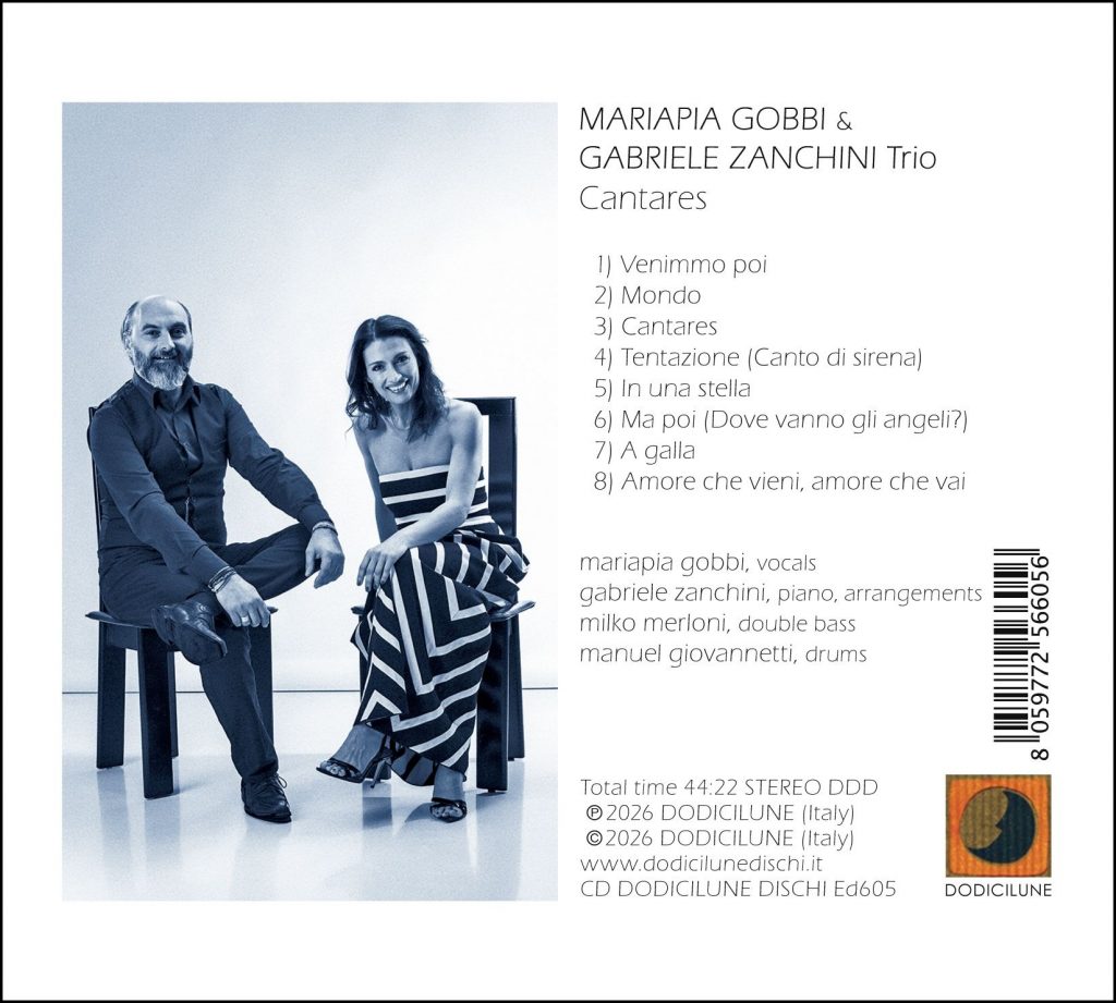 L’intero album sancisce un percorso che connette rigore e immaginazione, radicamento nella tradizione poetica e apertura verso una scrittura musicale che non teme la contaminazione, purché essa sia motivata da una necessità esecutiva. La presenza di Merloni e Giovannetti contribuisce in modo decisivo alla costruzione di un ordine intrinseco che sorregge il canto e il pianoforte senza mai sovraccaricare l’intelaiatura sonora. Il contrabbasso dispensa un fondamento elastico, versato nel modulare il proprio ruolo tra sostegno e intervento melodico, mentre la batteria lavora su una gamma di colori che arricchisce l’aura fonica con una varietà di sfumature. In sintesi «Cantares» si sostanzia dunque come un progetto che unisce poesia e musica in un equilibrio raro, frutto di un lavoro collettivo che valorizza le competenze di ciascun interprete e la loro attitudine all’ascolto reciproco. La voce di Mariapia Gobbi emerge come un centro espressivo che non domina, ma guida; il pianoforte di Zanchini costruisce spazi in cui la parola può risuonare; la sezione ritmica offre un terreno fertile su cui la musica può svilupparsi con naturalezza. Ne nasce un’opera che non cerca l’effetto, ma la profondità del gesto artistico, e che invita l’ascoltatore a un viaggio in cui la poesia diventa suono e il suono diventa pensiero.