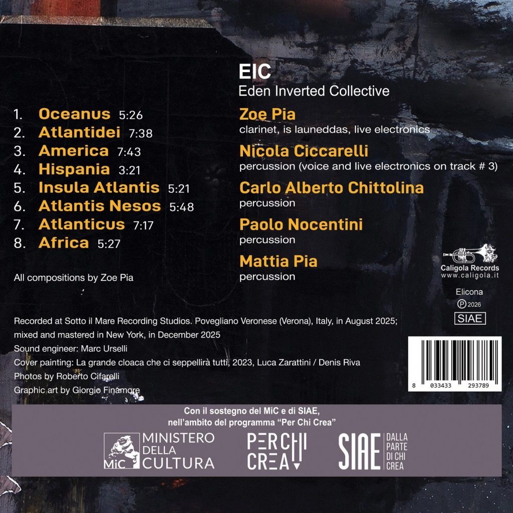 «Atlantidei» inaugura il percorso discografico dell’Eden Inverted Collective con un progetto che unisce quattro giovani percussionisti di formazione classica e la voce strumentale di Zoe Pia, impegnata qui con clarinetto, launeddas ed elettronica. La compagine nasce da un’idea che affonda nel dialogo tra arti visive e ricerca musicale, poiché l’album prende forma a partire dalla mostra «Post-Eden» di Luca Zarattini e Denis Riva, autori anche dell’immagine di copertina. Il risultato si posiziona in un territorio in cui la dimensione acustica, la memoria mitica e la riflessione sul rapporto tra umanità e ambiente convergono in un impianto compositivo di notevole coerenza.