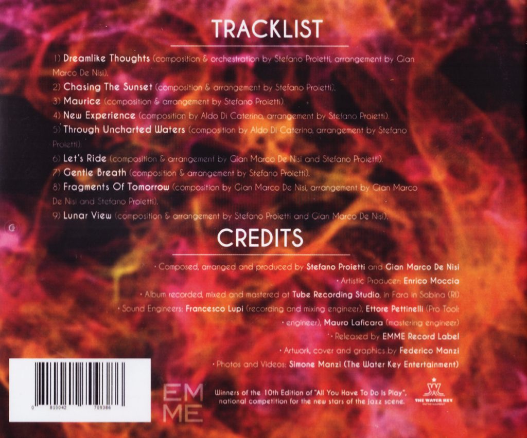 Il titolo «Gentle Breath» racchiude una suggestione simbolica che illumina l’intero progetto. L’immagine del respiro gentile non assume soltanto una dimensione poetica, bensì richiama un principio musicale fondamentale. Il respiro governa la modularità del fraseggio, orienta la distribuzione delle pause e definisce l’equilibrio tra impulso e distensione. Tale metafora, in ambito jazzistico, allude a una concezione del suono come organismo vivente, in cui l’interazione tra i musicisti genera un flusso condiviso di ascolto e risposta reciproca. All’interno di questo quadro, ogni composizione delinea una specifica prospettiva espressiva. «Dreamlike Thoughts», firmata da Stefano Proietti con arrangiamento di Gian Marco De Nisi, dispiega un ambiente sonoro di notevole raffinatezza, dove le progressioni armoniche sostengono una linea melodica dall’andamento contemplativo. «Chasing The Sunset» sviluppa un disegno armonico più rarefatto, quasi cinematografico, mentre «Maurice» suggerisce una scrittura attenta alla modulazione delle voci interne dell’ensemble, che si dipanano in un’aura brunita ed avvolgente. Aldo Di Caterino firma «New Experience» e «Through Uncharted Waters», pagine nelle quali il flauto assume un ruolo centrale nella definizione del colore sonoro. Il dialogo con le strutture armoniche del pianoforte e con il sostegno della sezione ritmica genera un equilibrio particolarmente efficace tra lirismo e movimento, producendo un’ambientazione più mediterranea ed un ampliamento della sfera narrativa. «Let’s Ride», composta da Gian Marco De Nisi insieme a Stefano Proietti, configura una pulsazione più marcata, lasciando emergere l’energia propulsiva del gruppo. Il titolo eponimo, «Gentle Breath», propone una scrittura sospesa, dall’aria lievemente retrò, dove la disposizione degli interventi strumentali favorisce un clima di ascolto reciproco e di progressiva espansione sonora. «Fragments Of Tomorrow», firmata da De Nisi con arrangiamento condiviso con Proietti, esplora un terreno armonico più articolato, con qualche tinta soulful, mentre «Lunar View» conclude il percorso con una pagina di forte vocazione urbana, quasi funkified, sostenuta da una tessitura strumentale attentamente calibrata.