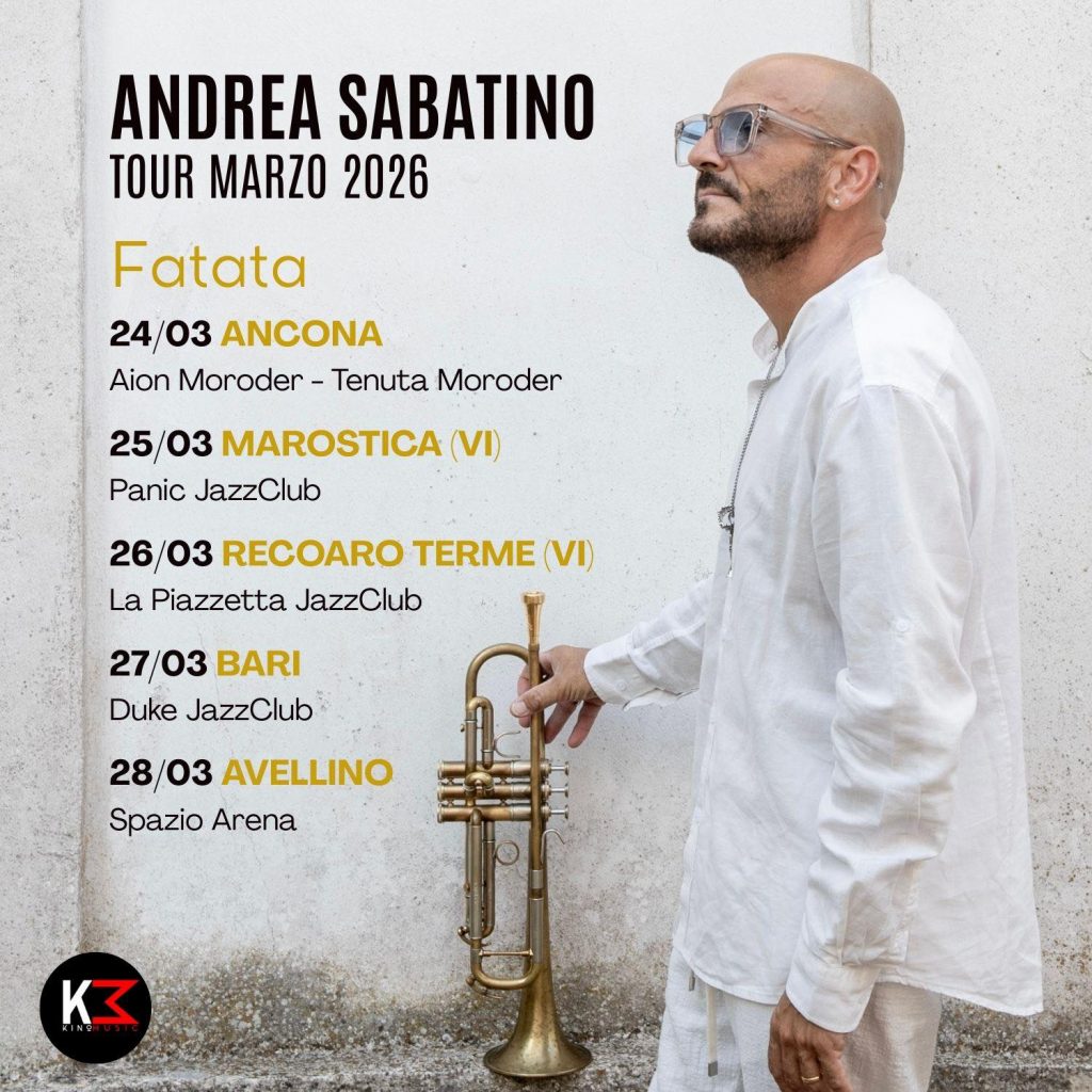 Tutto pronto per il tour di Andrea Sabatino, fra i più talentuosi trombettisti jazz e compositori italiani della sua generazione, che presenterà dal vivo il suo nuovo disco intitolato Fatata a partire da martedì 24 marzo presso l’Aion di Moroder (Tenuta Moroder), concerto inserito nel cartellone del prestigioso festival Ancona Jazz 2026 diretto da Giancarlo Di Napoli. Poi si proseguirà il 25 al Panic Jazz Club di Marostica (provincia di Vicenza), il 26 al jazz club La Piazzetta di Recoaro Terme (provincia di Vicenza), venerdì 27 al Duke Jazz Club di Bari e in chiusura, sabato, presso lo Spazio Arena di Avellino. La presentazione di questo album vedrà protagonisti gli eccellenti Claudio Filippini (pianoforte e tastiere), Antonio De Luise (basso) e Dario Congedo (batteria) al fianco del leader Sabatino.