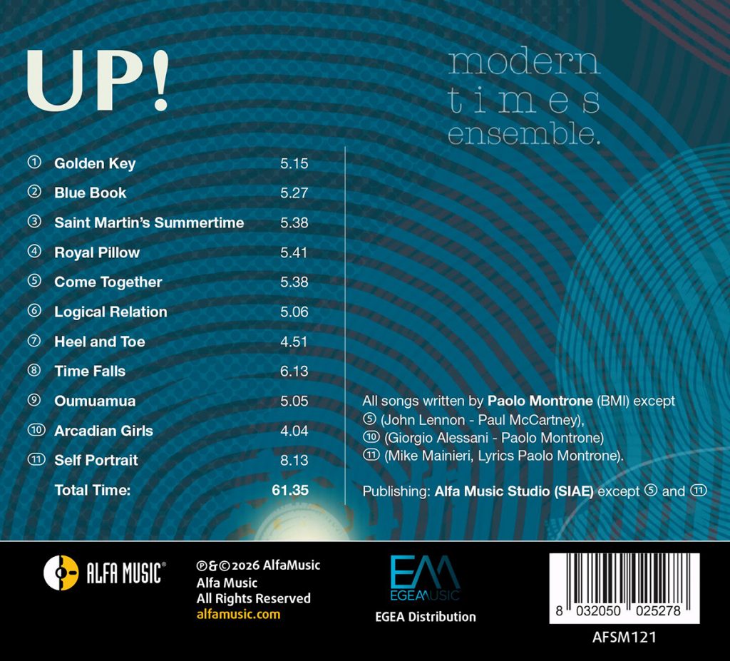 «UP!» del Modern Times Ensemble, sotto la direzione del chitarrista e compositore Paolo Montrone, s’impone quale esito maturo di un percorso già delineato in «Connections», ma qui condotto verso un assetto linguistico più ampio e consapevole. La progettualità non si limita ad ampliare il perimetro espressivo, ma riorganizza l’intero impianto compositivo secondo una logica strutturale più salda, nella quale scrittura, produzione e visione timbrica convergono in un disegno unitario. L’apporto di figure di primo piano della scena internazionale – Mike Mainieri, Allen Hinds, Travis Carlton, Donald Barrett, Matt Rohde, Jimmy Bralower e Paul Booth – non assume mai carattere ornamentale, ma interviene in qualità di elemento catalizzatore, capace di innervare la trama sonora con accenti differenziati e coerenti. A tale costellazione si affiancano Giorgio Alessani, la cui presenza apporta una dimensione narrativa incisiva e sfaccettata, e Mimmo Malandra, il cui intervento si attesta in una zona di confine tra lessico jazzistico e suggestione cinematografica, secondo una scrittura che privilegia l’allusione e la rarefazione del gesto melodico.