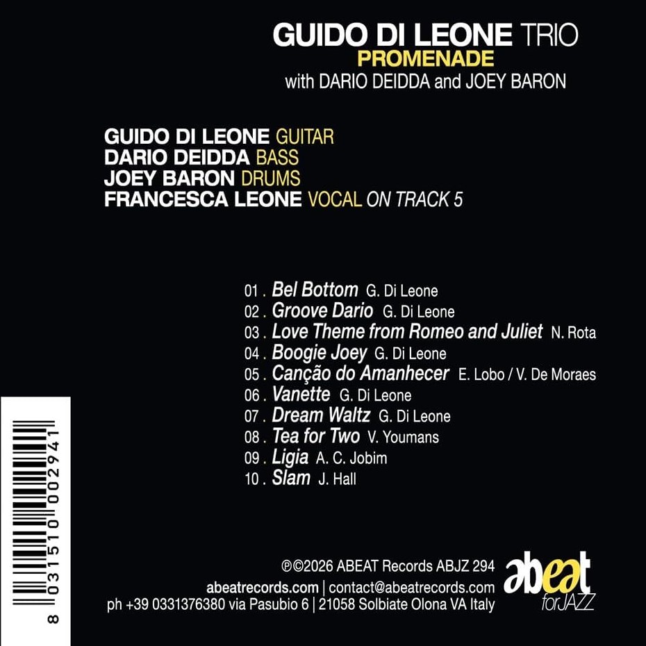 «Promenade», pubblicazione postuma di Guido Di Leone per Abeat Records, nasce da una sessione registrata presso il Mast Recording Studio il 27 maggio 2025, e reca in sé un valore che travalica la semplice testimonianza discografica, proponendosi piuttosto come compendio di un pensiero musicale giunto a piena maturazione.